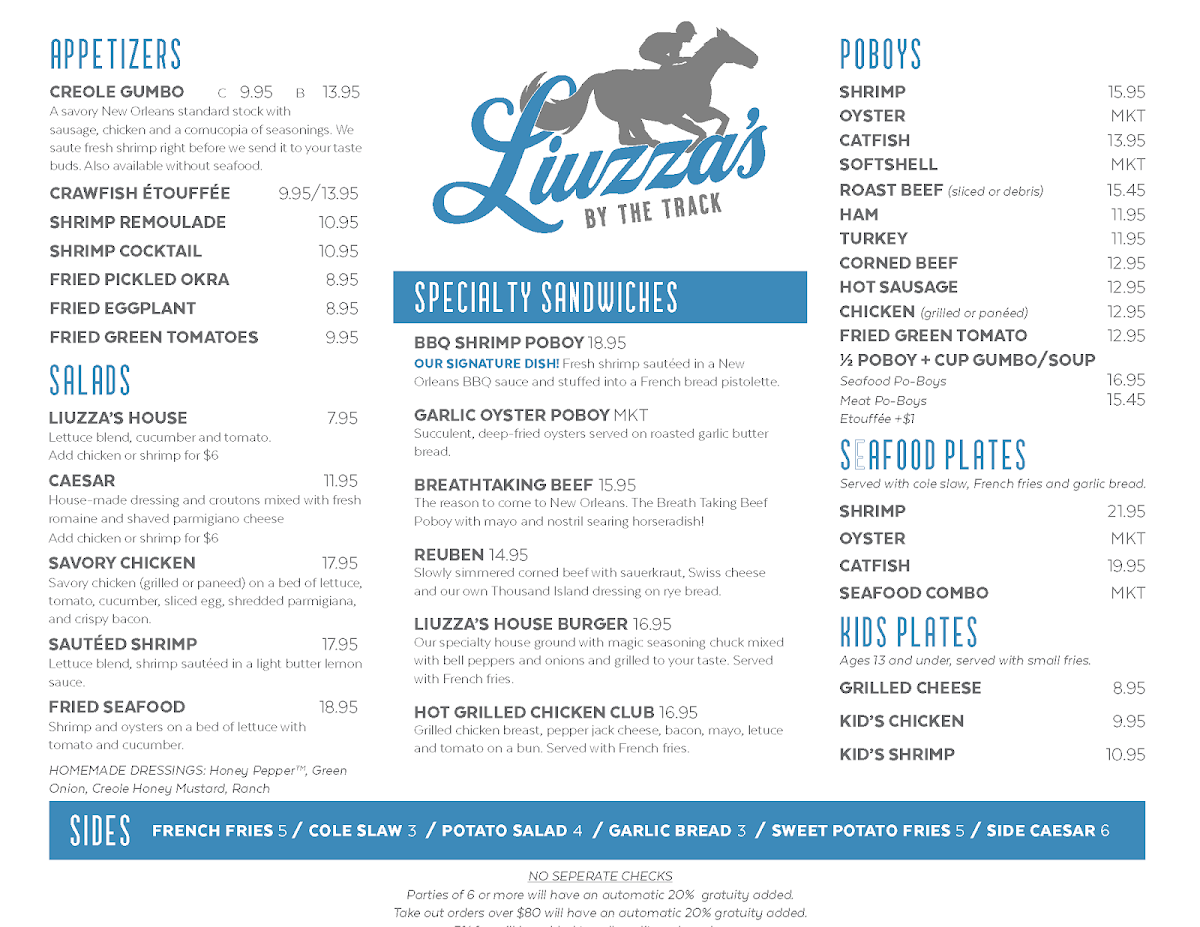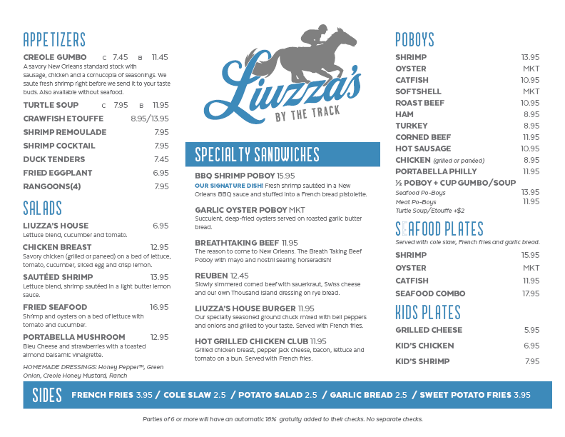 If you're in the mood for great food and a relaxed atmosphere, Liuzza's By The Track Menu is the perfect place to visit. Located at 1518 N Lopez St in New Orleans, LA, this local gem offers a variety of flavorful dishes that will satisfy every craving. From mouthwatering po'boys to hearty gumbo, each dish is made with fresh ingredients and local flair. You’ll also find a range of seafood options, including oysters and shrimp, cooked to perfection. Whether you're stopping by for a quick bite or enjoying a leisurely meal with friends, there's something for everyone on the menu. Pair your meal with a cold drink and experience the true taste of New Orleans in every bite.